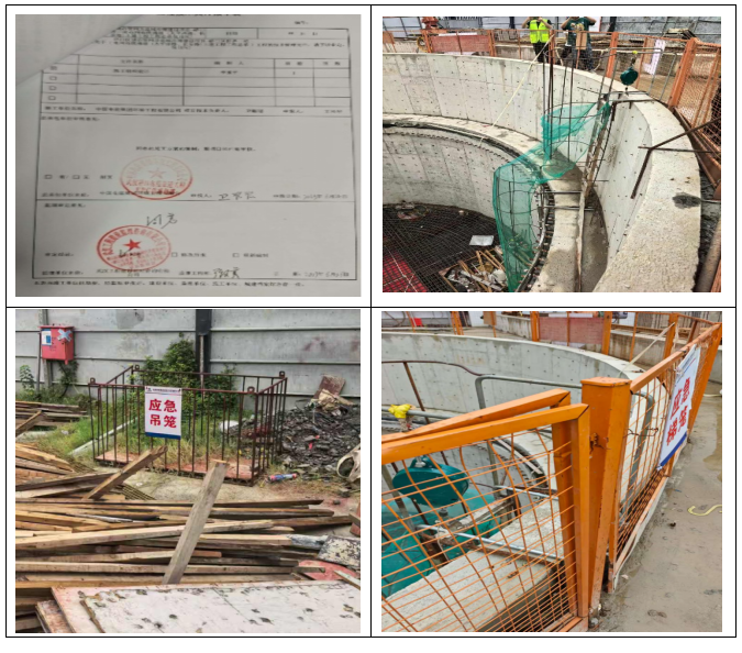 存在问题:施工组织设计、基坑危大方案、45T龙门吊安拆专项方案未加盖企业公章,总工未签字审核,未加盖总监理工程师执业印章;龙门吊已经报拆,安拆人员非起重设备安拆特种人员;人员上下梯道不牢固;吊笼采用螺纹钢焊接而成;沉井内水泥块、木枋等杂物未清理干净;沉井侧壁土体变形较大;临边防护不牢固。