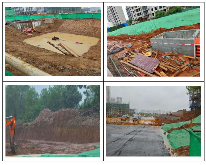 存在问题:边坡开挖未放坡,坡边堆载;基坑积水,上下安全爬梯不符合要求;基坑两侧防护栏杆未按规范设置;工地周边围挡封闭不严密;项目安管人员变更未经过监理单位证照审核。