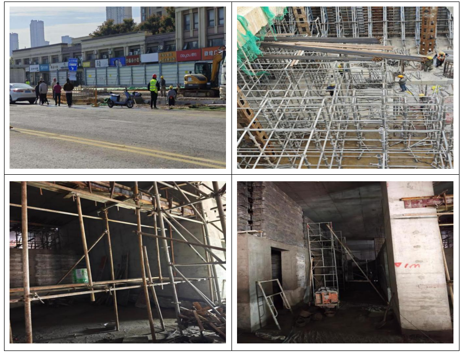 存在问题:芳草路东侧预埋段模板支架施工,上部材料堆积过多、下部人员施工,存在交叉作业风险;芳草路南侧外挂、3号出入口砌墙抹灰施工处临时照明严重不足;芳草路南侧外挂过门梁模板支架搭设不规范,立杆悬空,基础不牢。