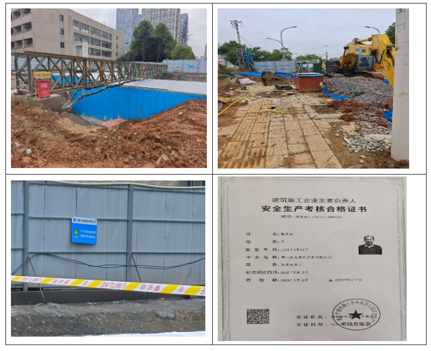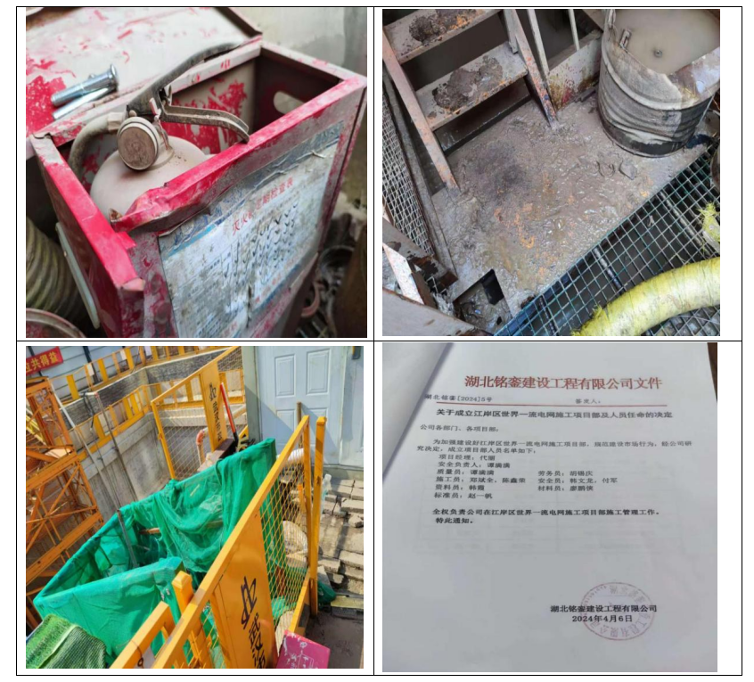 存在问题:顶管始发井坑底灭火器脏污,灭火器配备不全;坑底梯笼油泥较多未及时清理;应急逃生通道封闭不通畅;劳务单位湖北铭銮安全总监谭某某公司任命与其项目实际职务不一致;农民工工资分包代发未开设专户;未见农民工工资保函。