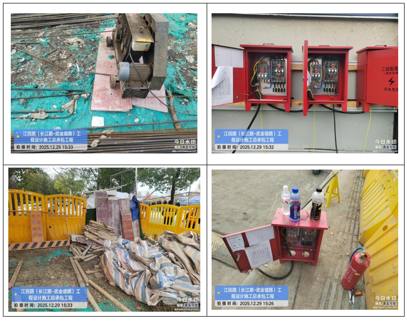 存在问题:领导带班检查记录缺失;分包单位特种作业人员进场未报审;用电回路保护接地缺失,配电箱存在串接不符合“三级配电、两级保护”原则,配电箱箱体未水平固定架设;模板木方堆放处未配备灭火器,不符合消防管理要求。