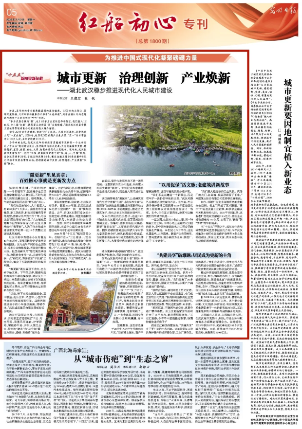 昙华林的生机,是武汉近年来推进高质量城市更新的一个生动切片。“十五五”规划建议提出,坚持城市内涵式发展,大力实施城市更新,建设创新、宜居、美丽、韧性、文明、智慧的现代化人民城市。近年来,武汉把城市更新作为“一把手”工程,聚焦城市更新中的“钱、地、人、手续”难题,出台改革清单20项、首批支持政策18条,制定金融支持10条政策和5亿元市级专项资金管理办法,持续推进城市更新、治理创新、产业焕新“三新”融合。